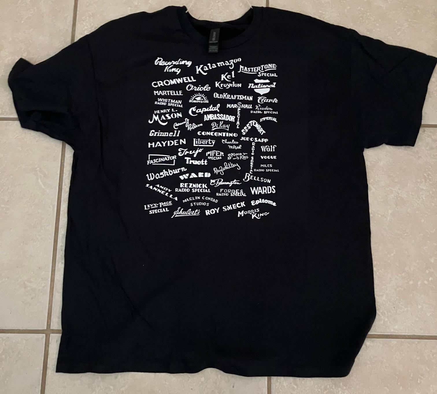 The Other Brands of Gibson T-Shirt available in Large, XL and 2XL. High quality Gildan heavy black cotton short-sleeve shirt with white design with the logos of 40 different brands Gibson manufactured pre-WWll, including Kalamazoo, Recording King, Kel Kroydon, Mastertone Special, Cromwell and many more.