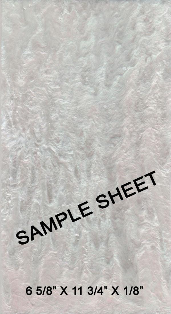 1 – sheet 6 5/8” 11 ¾” x 1/8” acrylic faux white mother-of-pearl that’s great for inlay and guitar pickguards. This material looks like real opaque white MOP with slight pink and blue hues. Much easier to cut than real pearl with coping saw or band saw, and much less expensive. Comes with protective film on both sides.